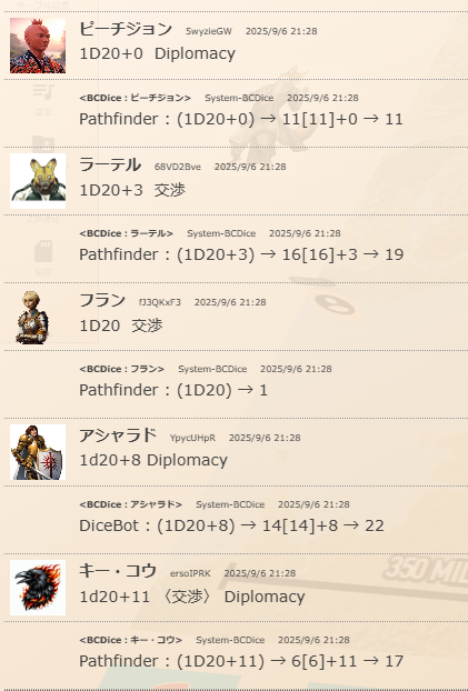 +PC+ | PCリスト。 キー・コウ PL:VANさん ラーテル・ザ・ウィニー PL:ナカムーさん アシャラド PL:カゲシタさん フラン PL:pearl_of_power |