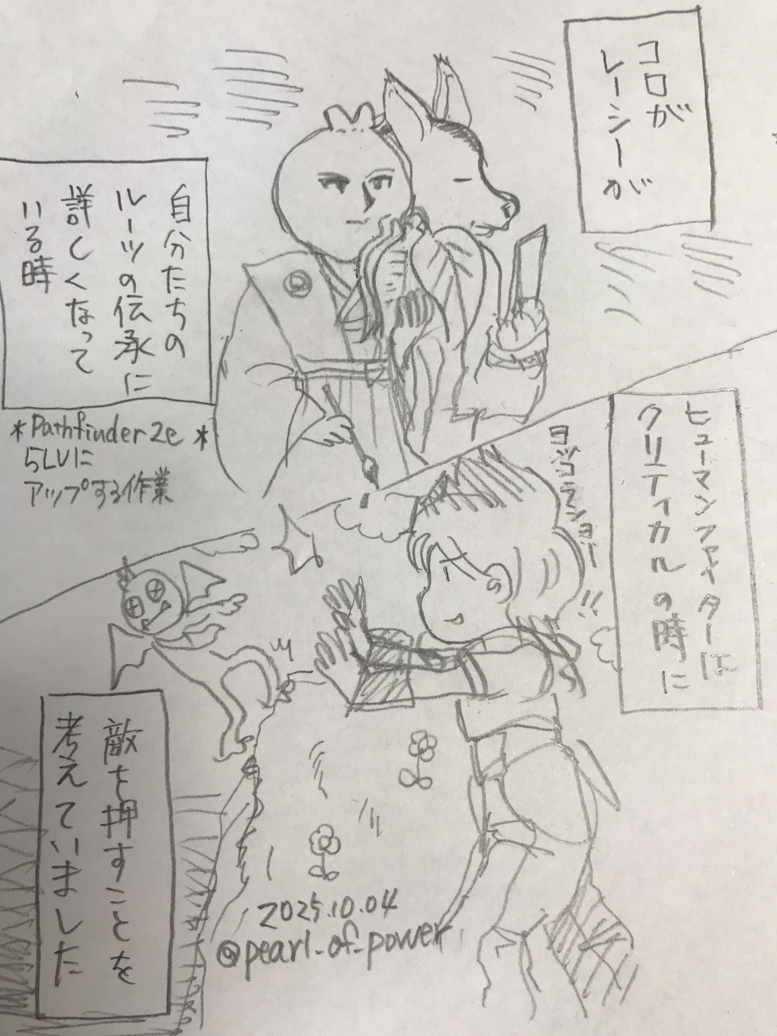 +コメント+ | Pathfinder 2e、オンセでキャンペーン、できます! まずは自分でキャラクターを作るトコロに来ています…が、ルールをわかっていない場合はこんなにキャラクター作成難しいとは…!まずはルールブックを買いました…英語版でも手元に置けるだけよいかと…!(2025/03/03) フランソワルトンのアカチャンがかわいすぎたのでそこから名前を頂き …好きだなお菓子を名前につけるの! NPCの名前で引くほど笑っている自分がいるんですが大丈夫ですか自分…? PCのみなさんと慣れてきました…が、今度間が空くとルール忘れるこの脳みそ…なんとかしたい!ゲームの準備、自分に怒りながらしていました…そんな人いるの… あまりのぱーるの理解の悪さに、GMがエクセルのキャラクターシートをお試しでデータ入れてくれました…なるほど…こうしてこうなるのね…とようやく理解できたところです!一度理解すると英語のキャラクターシートも随分わかるようになってきました!ありがたや!そうして…何とかゲームの中で基本的な戦闘の事についてきかなくなってきましたが、次回はもうラストだそうです…がんばれ!楽しんでいることをみんなに伝えられるよう、最終回こそ誰にもルール聞かなくても取り回しできるよう覚えよう!(2025/10/04) |